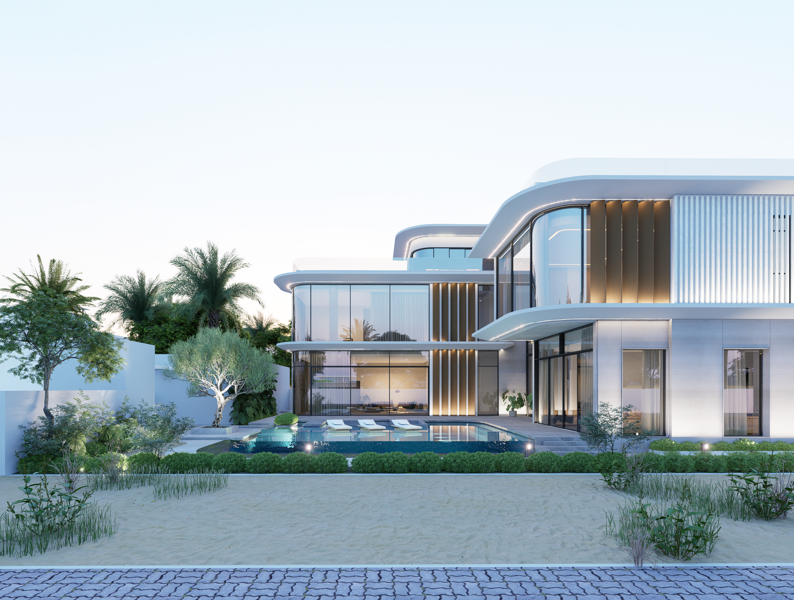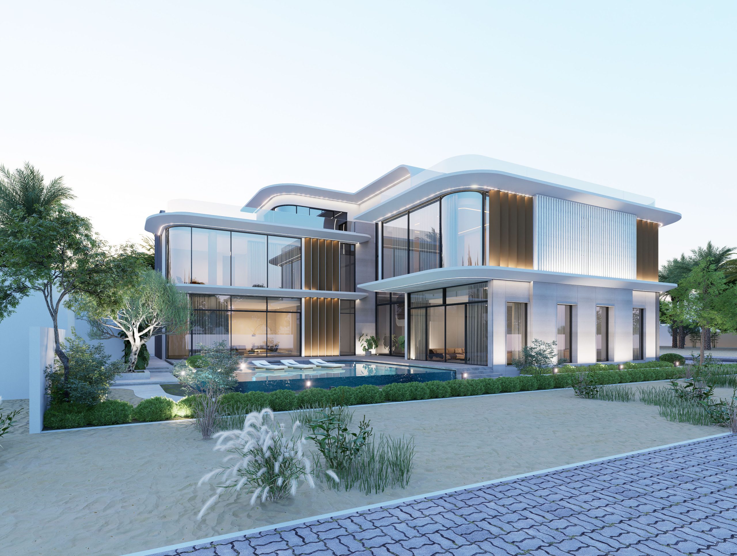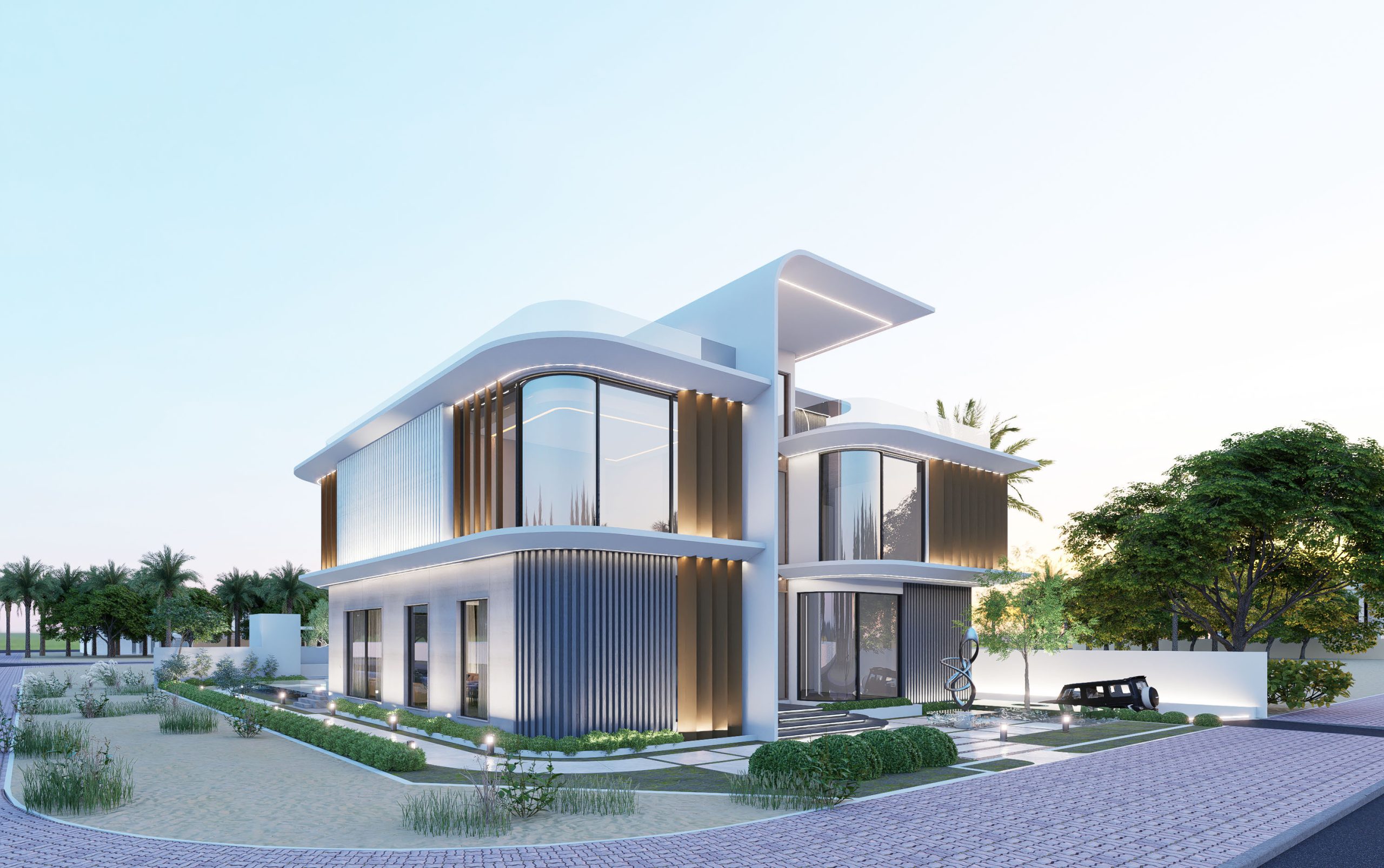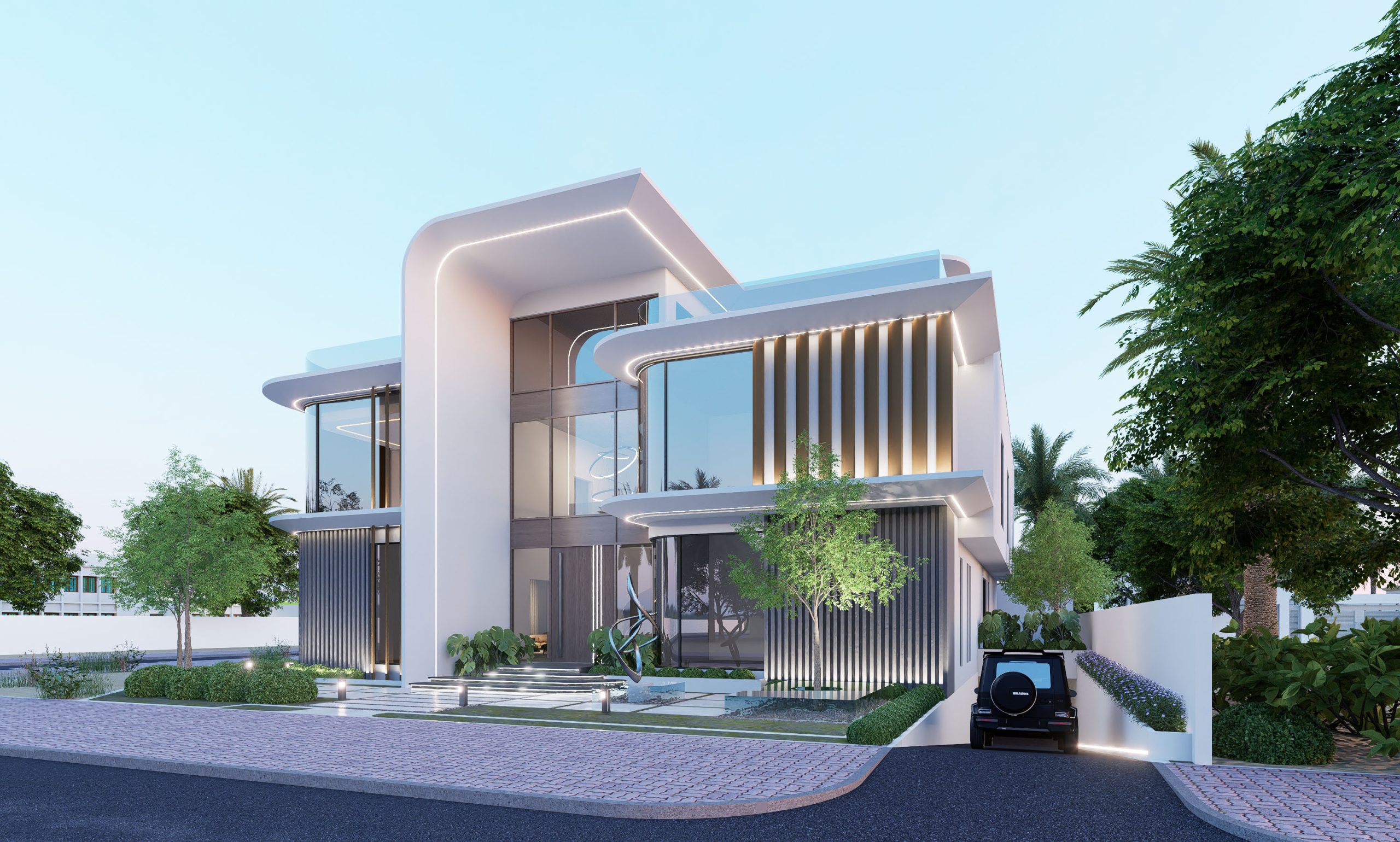 This modern luxury villa is designed with a fluid contemporary form characterized by curved slab edges, full-height glazing, and vertical shading fins that enhance thermal performance and visual rhythm. The central double-height entrance volume provides axial symmetry and maximizes natural daylight penetration.